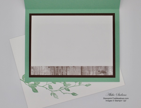I decorated the inside of the card by attaching a strip of the wood panel DSP from the Come to Gather paper pack on a panel of Whisper White and adhering it to an Early Espresso mat before attaching it to the inside of the card. I finished a matching envelope by stamping it with the Very Versailles leaf branch in Mint Macaron ink.