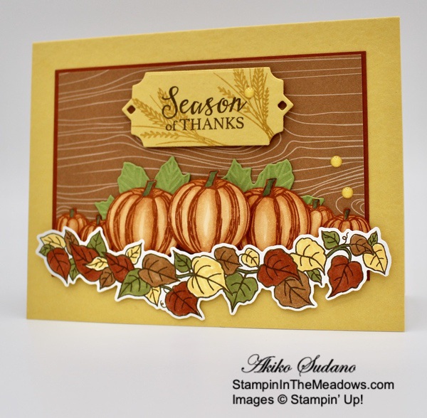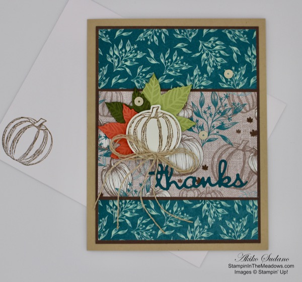 Good Morning! Today I’m sharing my final Thanksgiving card for this year – I’ll be sending them out to my family this week and moving on to finishing up Christmas cards. Kind of sad because I really love the fall season. This is the card I made during my Facebook Live video tutorial yesterday afternoon and it is full of pumpkins from the Stampin’ Up! Gather Together stamp set and Gathered Leaves dies. And I filled it out with an Autumn version of the new Quite Curvy leaves! You can find the supplies used to create this card at the bottom of my post along with the sizes of cardstock used.