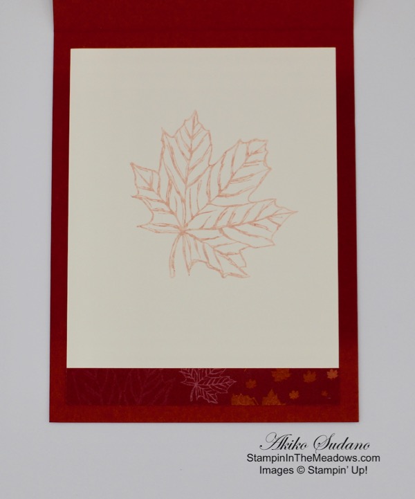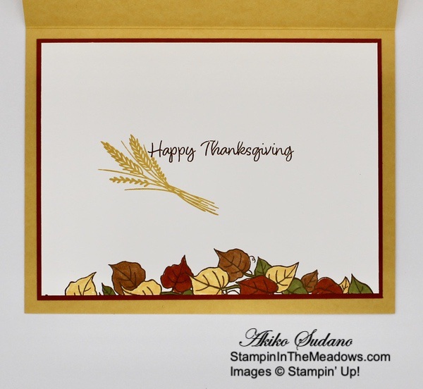 I stamped the sentiment from the Banner Year photopolymer stamp set in Cajun Craze ink on a Whisper White panel. I stamped the wheat sheaf from the Stampin’ Up! Gather Together stamp set in Bumblebee ink next to the sentiment and stamped the leafy vine in Soft Suede ink on the bottom. I colored the leaves with dimensionals like the card front and adhered the panel to a Cajun Craze mat before adhering it to the inside of the card.