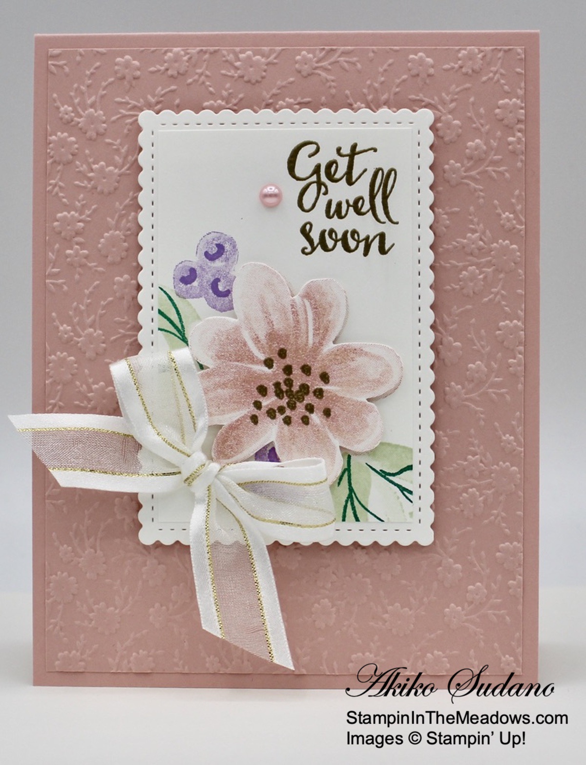 Good Morning! Last week I made the cards from the Stampin’ Up! Gorgeous Posies kit (you can see the cards from the kit here) and I said that the stamp set is beautiful and makes pretty cards on it’s own. So Today, I’m using the stamps by themselves to make a pretty floral get well card in Blushing Bride! You can find the supplies used to create this card and the card stock cuts at the bottom of this post.