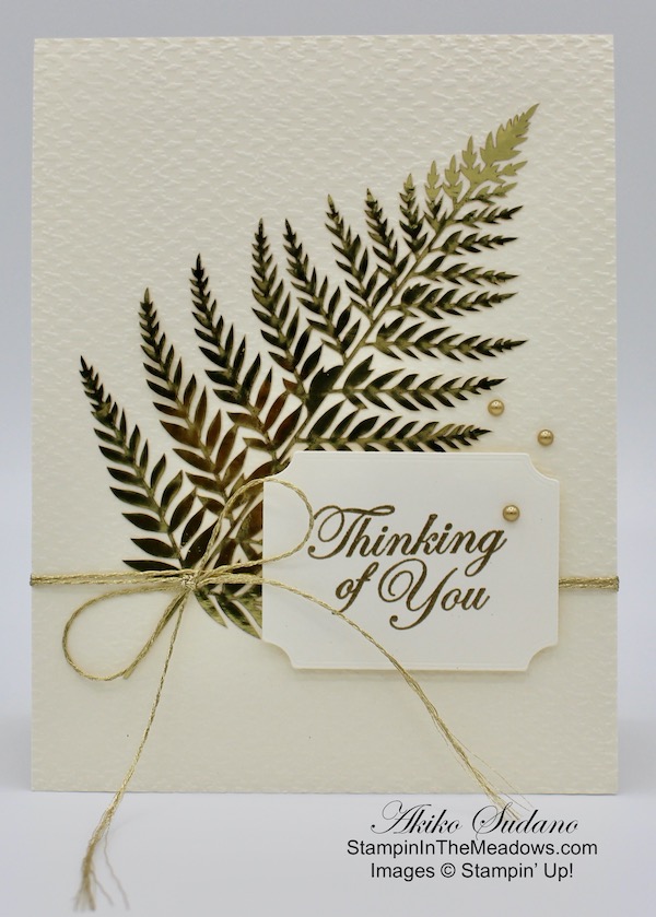 I embossed a panel of Very Vanilla cardstock with the Tasteful Textile 3D embossing folder and adhered it to the front of a Thick Very Vanilla card base. I adhered the beautiful large gold fern leaf from the Stampin’ Up! Forever Gold specialty laser cut paper to the front with small dots of liquid glue.