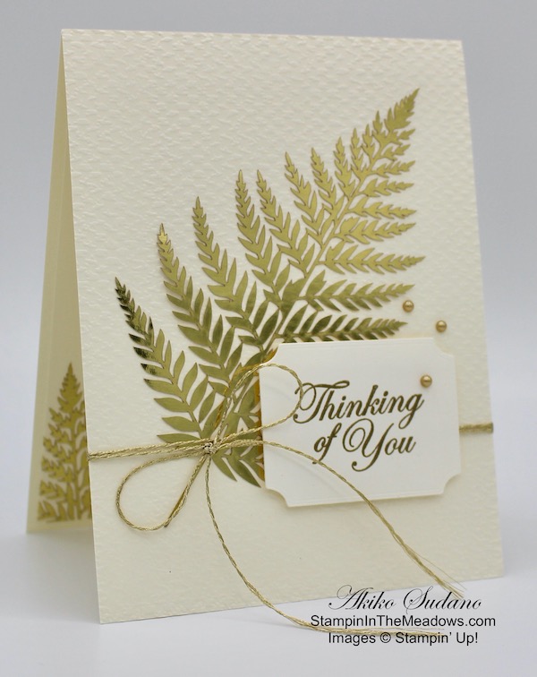 This card is so simple, but the gold foil leaves from the Stampin’ Up! Forever Gold specialty laser cut paper makes it so elegant and special. And while this card is a thinking of you card, you could replace the label with any sentiment and use it for many different occasions from a wedding card to a masculine birthday card. Here are all the pretty laser-cut gold foil elements that come in the set – you get three of each!!