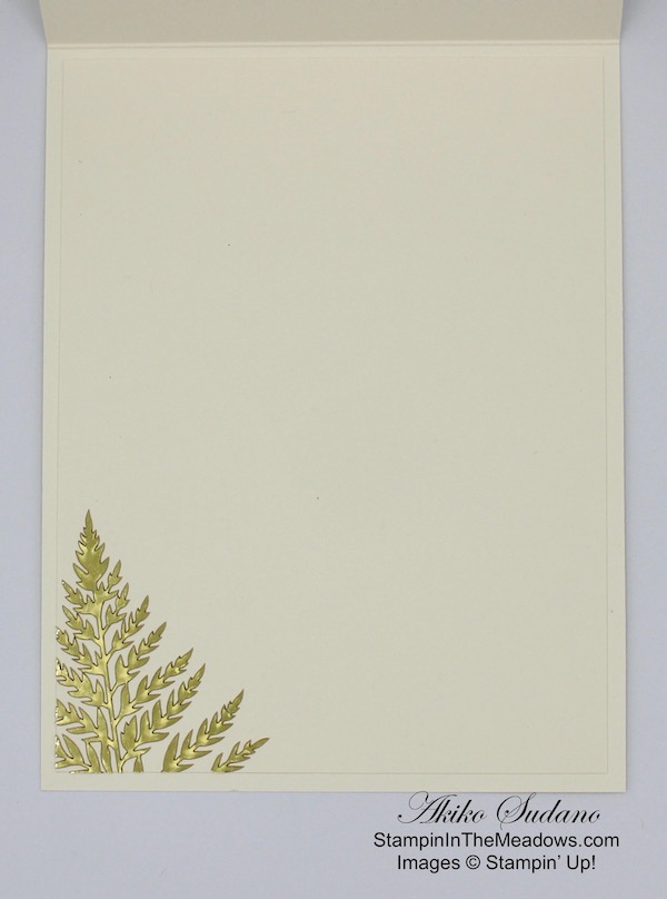 I cut the top of another large gold fern from the Stampin’ Up! Forever Gold specialty laser cut paper and adhered it to the bottom corner of a Very Vanilla panel with dots of liquid glue. I adhered the panel to the inside of the card.