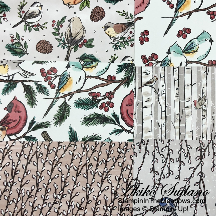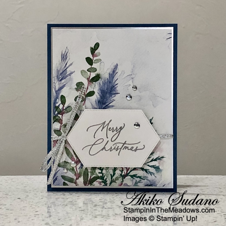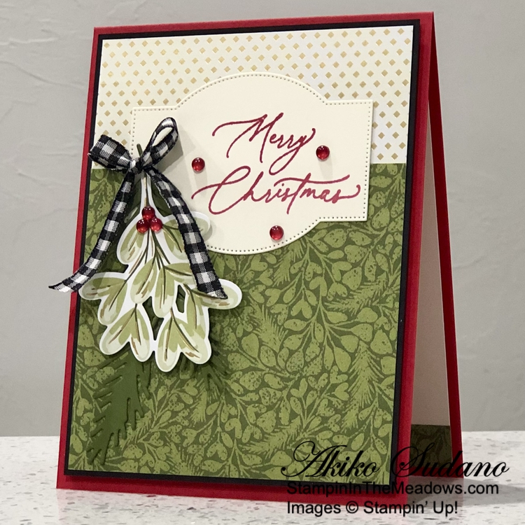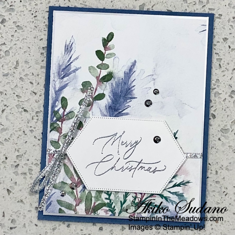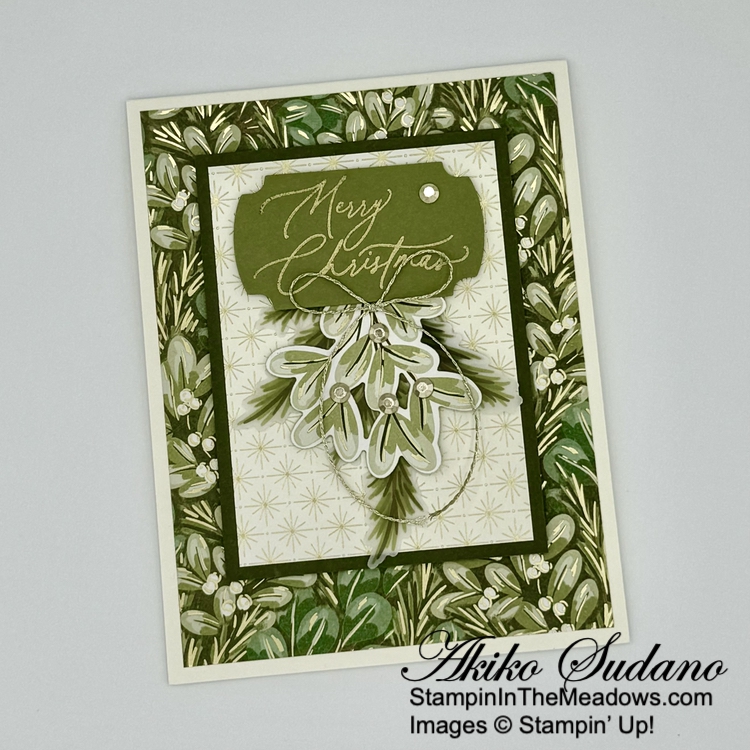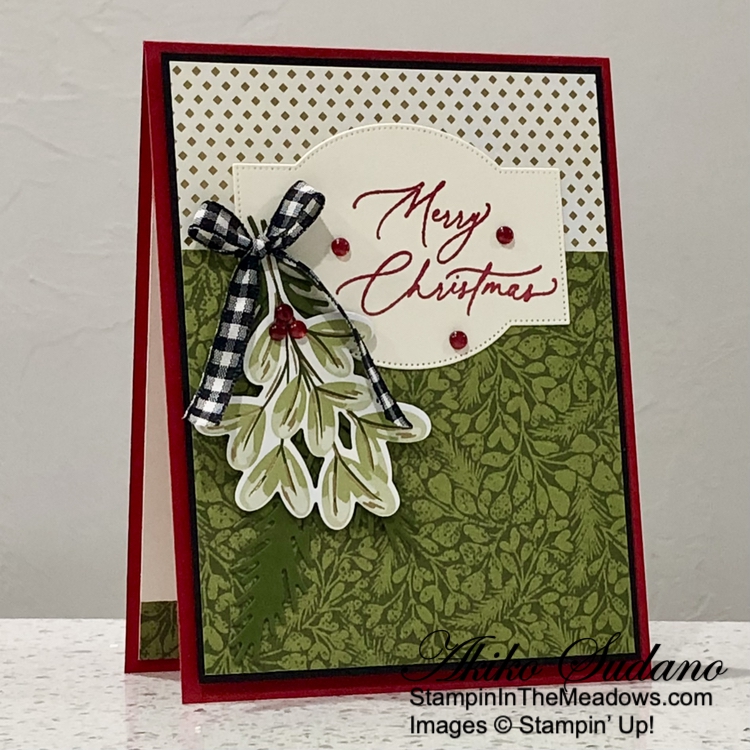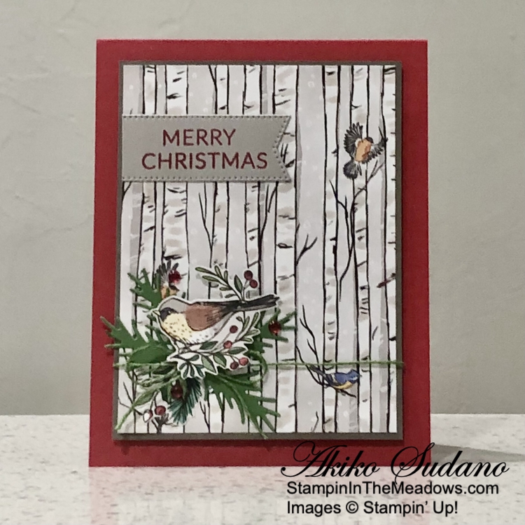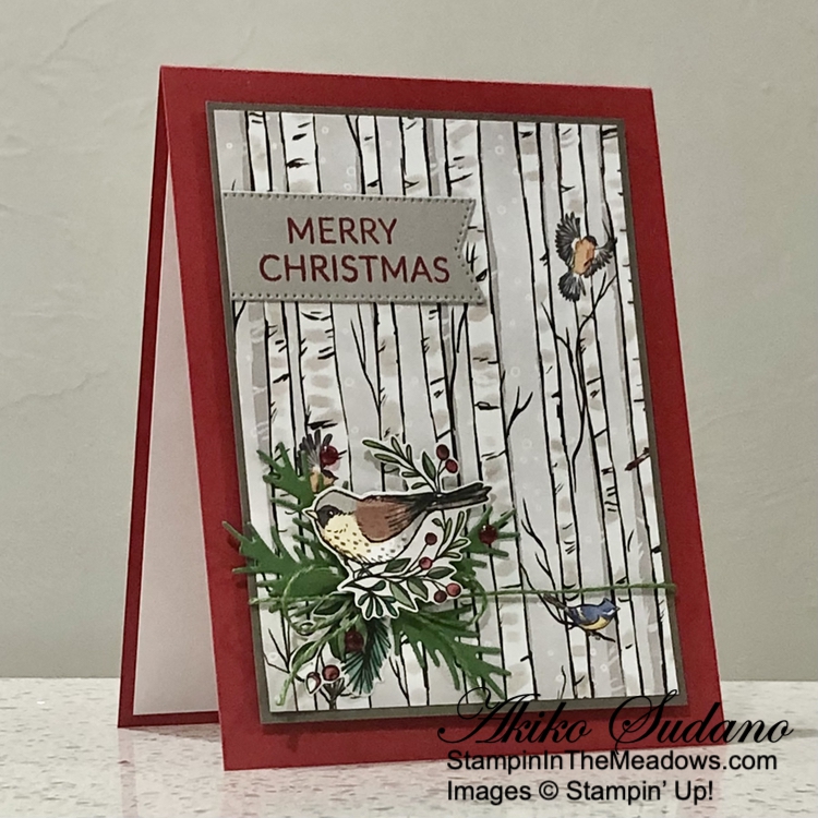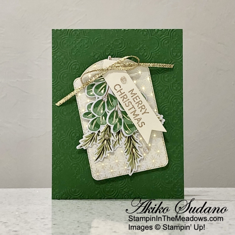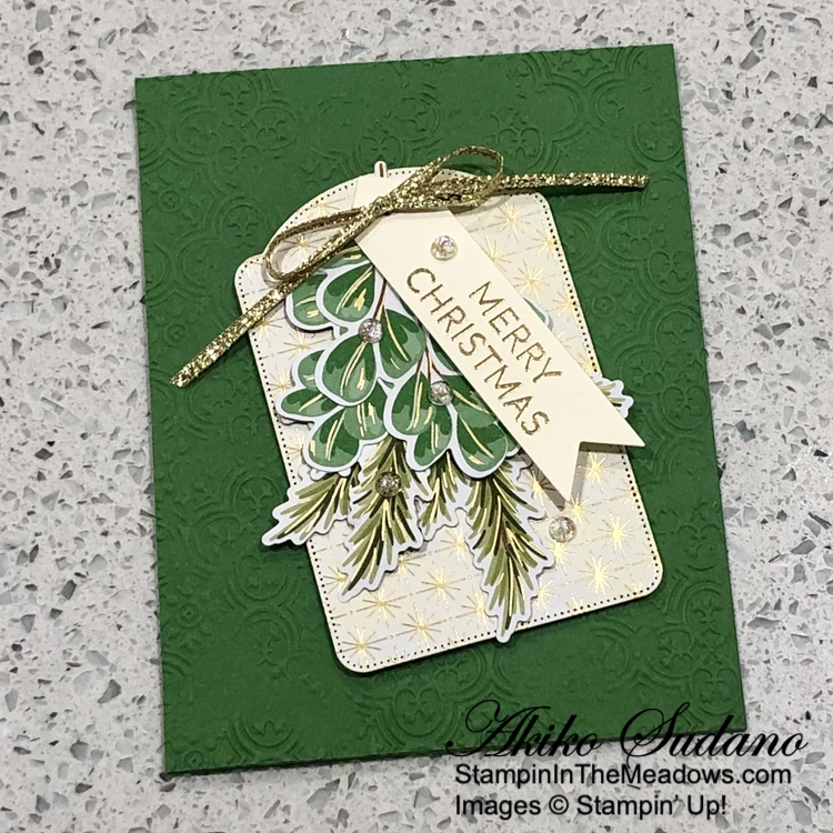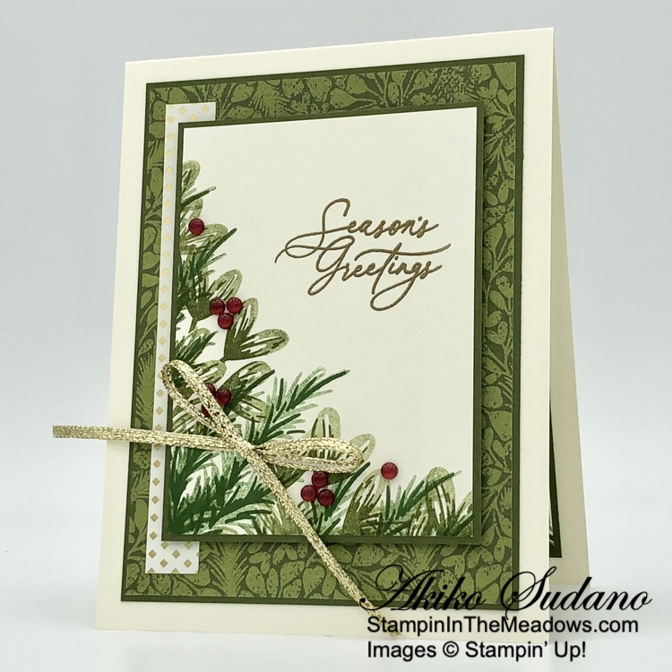 I I used the plain tree die from the Stampin’ Up! Decorative Trees dies to cut two panels from the Season of Green and Gold specialty designer series paper. I adhered the trees to the card with glue dots.