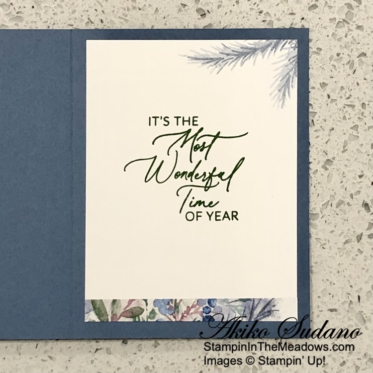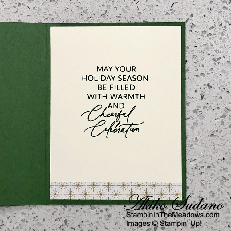 For the inside panel, I stamped sentiments from the Greetings of the Season stamp set using Versamark ink on a Very Vanilla panel. I sprinkled it with gold embossing powder and shook off the excess. I heated the powder with my heat tool until it was bright and shiny. I adhered the panel to a DSP mat and adhered the layered panel to the inside of the card with Stampin’ Seal.
