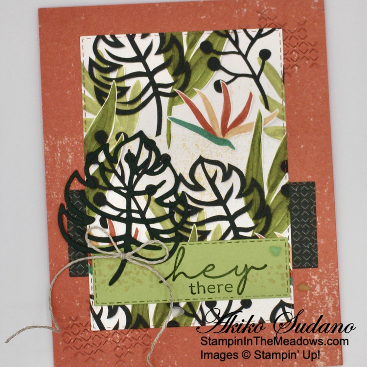 I used one of the leaf sprig dies from the Stampin’ Up! Notes of Nature dies to cut a parakeet panel twice. I adhered the die cut leaf sprigs to the card with glue dots.