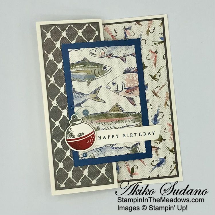 I embossed a Crumb Cake panel with the Exposed Brick 3D embossing folder and adhered it to the front of a Pecan Pie card base. I adhered a Pecan Pie plaid panel of the Lets Go Fishing designer series paper to the embossed panel with liquid glue.