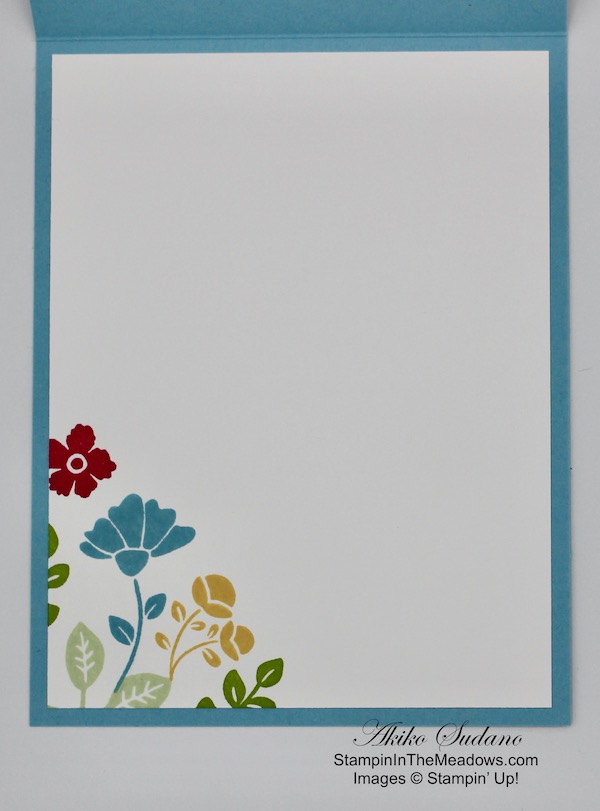 For the inside of the card, I stamped the flower and leaf from the Stampin’ Up! Boughs and Blossoms stamp set in Daffodil Delight and Granny Apple Green on a Basic White panel. I added some Poppy Parade flowers from the Lovely You stamp set and trimmed the side with a strip of DSP .