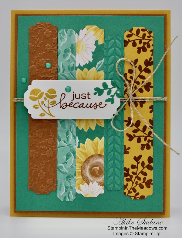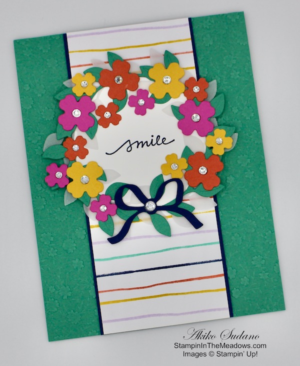 Good Morning! The Stampin’ Up! Boughs and Blossoms bundle is a pretty floral cling stamp set that comes with sweet sentiments and a two sided punch that punches out leaves on one side and flowers on the other. The flowers are solid graphic floral designs rather than line art designs and they are very versatile. Today I made my own DSP panel in Polished Pink, Daffodil Delight, Granny Apple Green and Poppy Parade with these pretty floral stamps, and I pulled in the little flower from the Lovely You stamp set as well. You can find the supplies I used at the bottom of my post along with the sizes of cardstock used.
