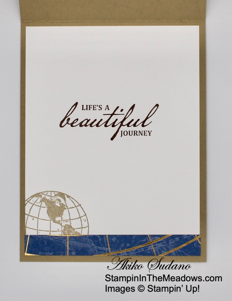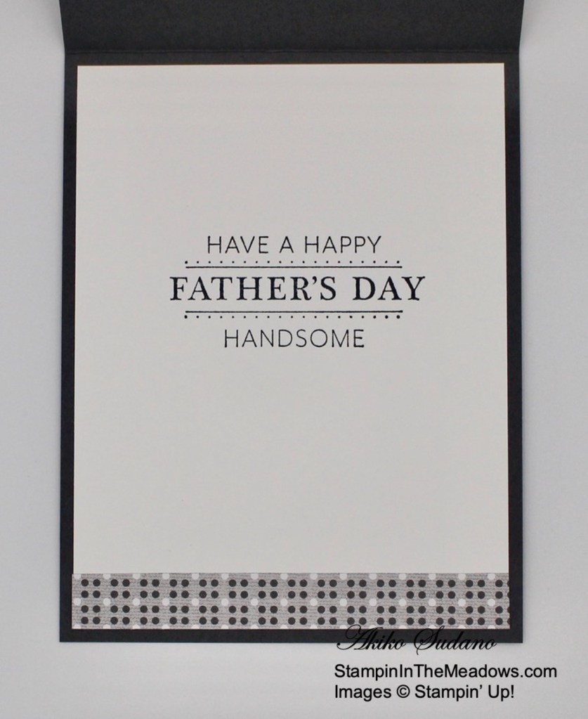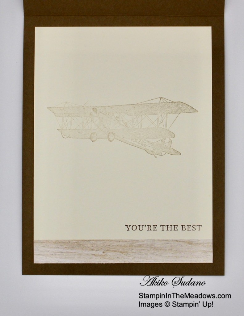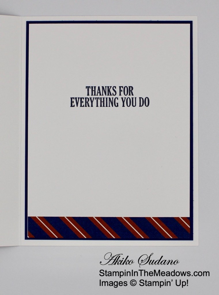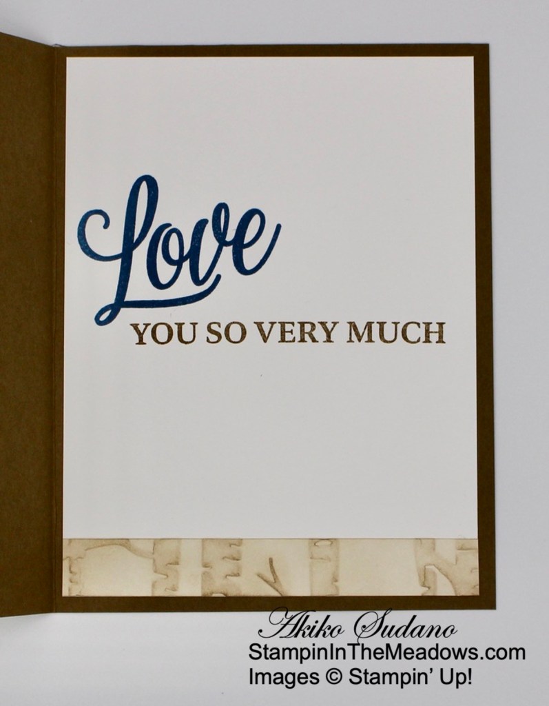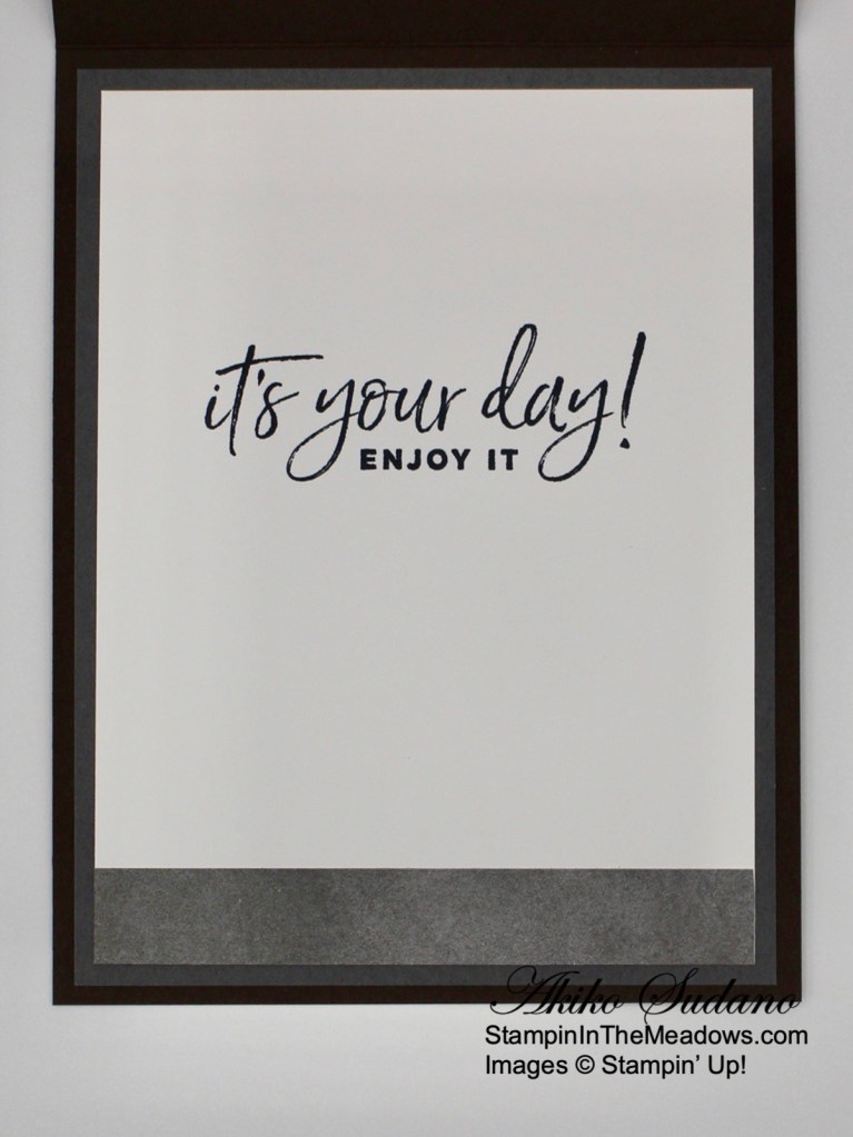 For the inside of the card, stamp the sentiment from the Stampin’ Up! Brewed For You stamp set in Soft Suede ink on a Basic White panel. Stamp the large jug next to the sentiment in Gray Granite ink. Trim the bottom of the panel with a strip of Rustic Harvest DSP and adhere the panel to the inside of the card with Stampin’ Seal.