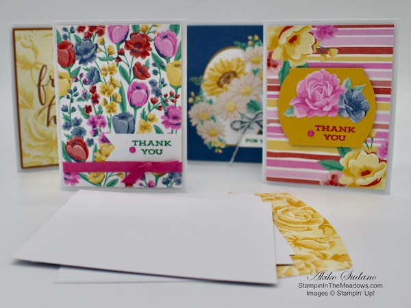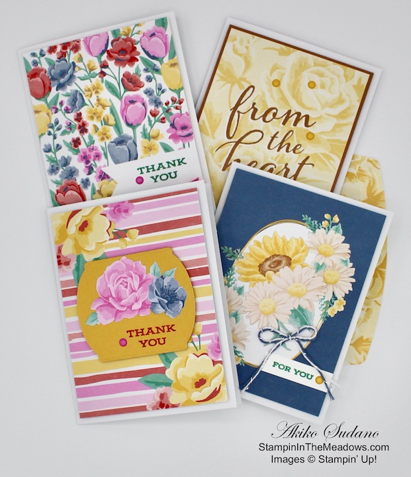 For the second card, I used the Stampin’ Up! Dandy Garden Memories and More cards and envelopes again, this time pairing it with the Dandy Garden 6″ x 6″ designer series paper. The Stampin’ Up! Memories and More card packs coordinate with the designer series papers in the Product suites, so you can use your DSPs with the cards for scrapbooking, memory keeping and card making! I trimmed the card with a Bumblebee Thank You sticker from the Memories and More card pack and one of the cute ladybug trinkets!