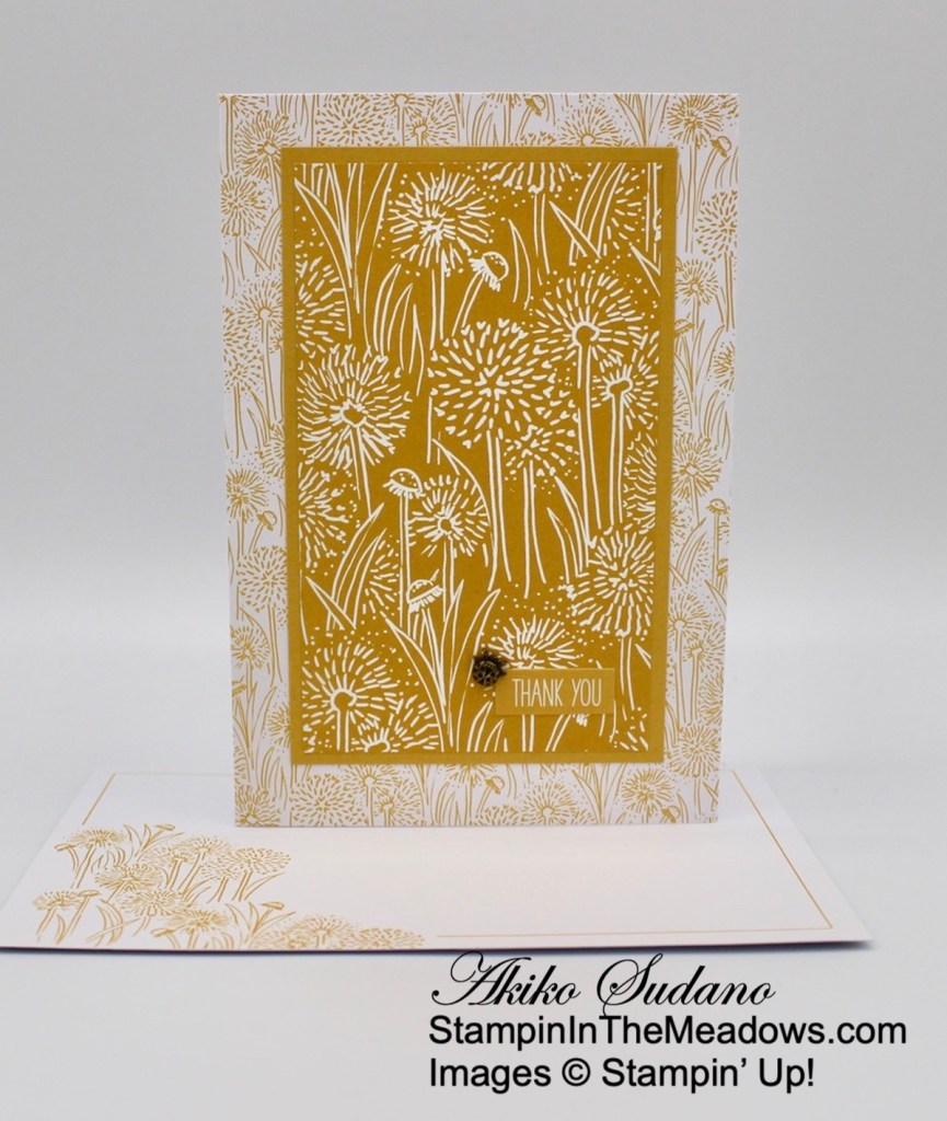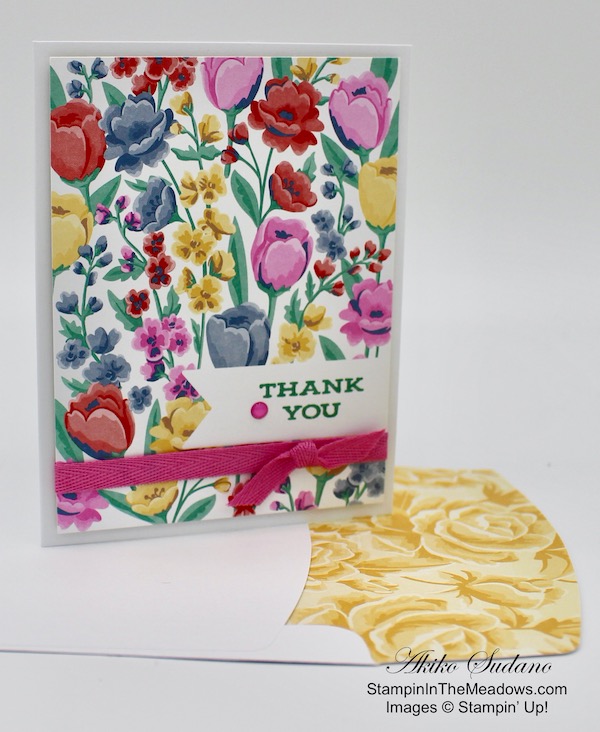 For the first one, I adhered one of the 3″ x 4″ Stampin’ Up! Dandy Garden Memories and More panels to a Mossy Meadow mat and then adhered both to the front of a pretty card base from the Dandy Garden Memories and More cards and envelopes. The Mossy Meadow card has the same print as the Bumblebee card front, and it is pre-printed with a smile sentiment, so it’s perfect. I dressed it up with one of the bumblebee stickers and a bow made with the Bumblebee gingham ribbon. Note that the envelope flap lining has the same print – how fun!