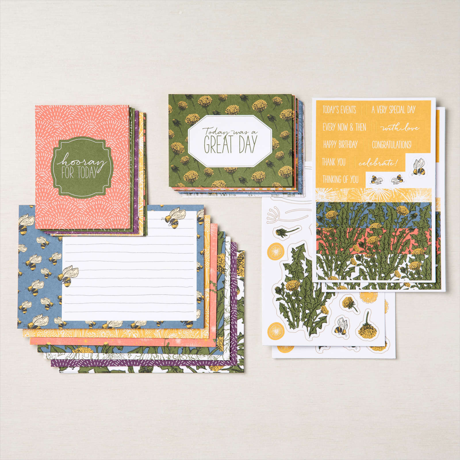 For the last card, I adhered another one of the pretty Stampin’ Up! Dandy Garden Memories and More 3″ x 4″ cards to the front of a Basic White note cards and envelopes. And I trimmed this card with more stickers – a pretty sentiment and bumblebee.