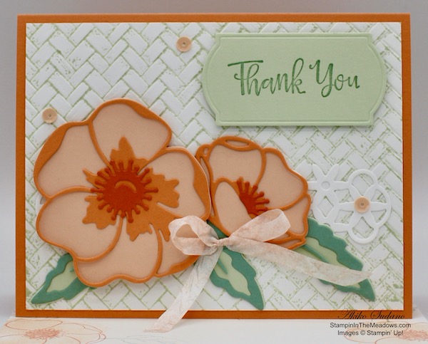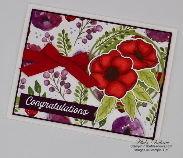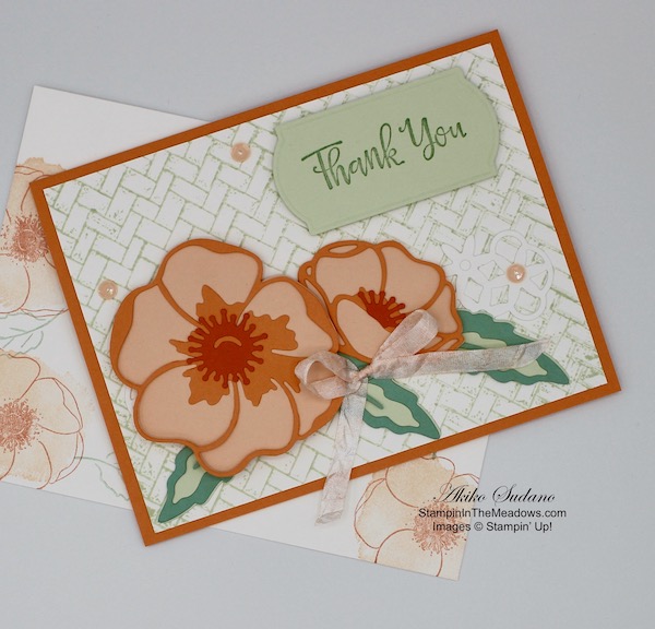 I adhered a panel of Flowering Fields designer series paper to a Basic Black mat with liquid glue. I stamped the poppies from the Stampin’ Up! Painted Poppies cling stamp set in Memento Tuxedo Black across a Basic White panel. I colored the flowers with the Poppy Parade Stampin’ Blend and adhered the panel to another panel of Flowering Fields DSP.