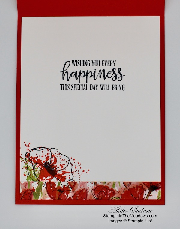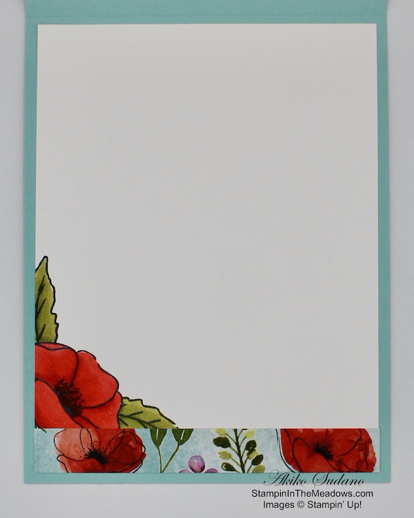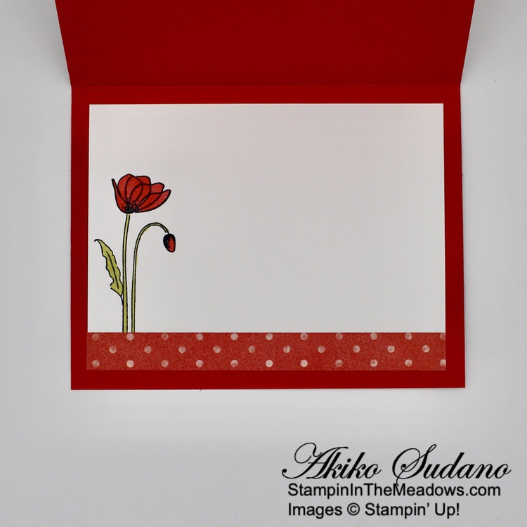 For the inside of the card, I stamped the the single poppy flower from the Stampin’ Up! Painted Poppies stamp set in Memento Tuxedo Black on a Basic White panel. I colored the flower with a Poppy Parade Stampin’ Blend and the stem and leaves with an Old Olive Stampin’ Blend. I trimmed the bottom with a strip of Flowering fields DSP and adhered the panel to the inside of the card.