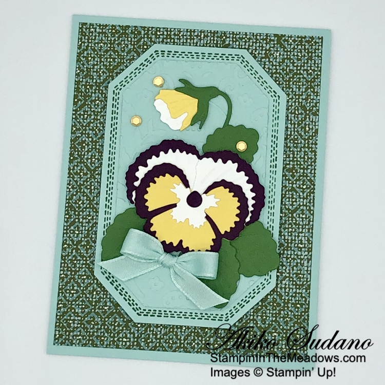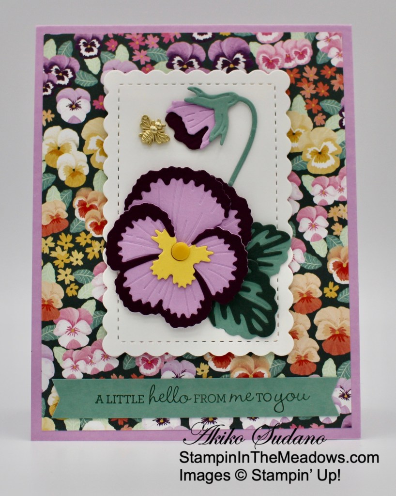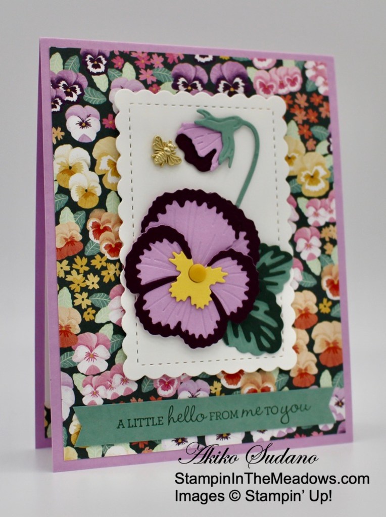 I am always anxious to plant flowers in the spring when it’s too early, so pansies are my go to since they can stand up to the cold nights. And This week I managed to get some in the ground by my mailbox, so I had to make a card using the pretty Stampin’ Up! Pansy Patch stamp and dies to celebrate. Sadly, these pretty items are on the retiring list, and beginning April 9, the dies will be on sale!