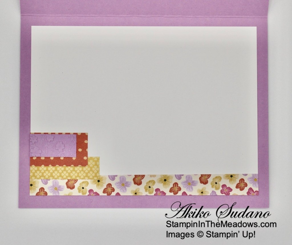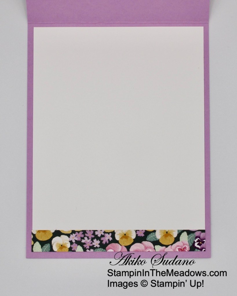 For the inside of the card, I decided to stamp a pansy using the Stampin’ Up! Pansy Patch stamp set on a Basic White panel. I stamped the small flower detailed stamp in stamped off Blackberry Bliss and the center in Daffodil Delight. With the darker outline, it was easy to line up the Daffodil Delight center. I covered the flower with a mask and stamped the leaves in Garden Green. I finished by stamping the center in Blackberry Bliss and trimming the bottom of the panel with DSP. I adhered the panel to the inside of the card with Stampin’ Seal.