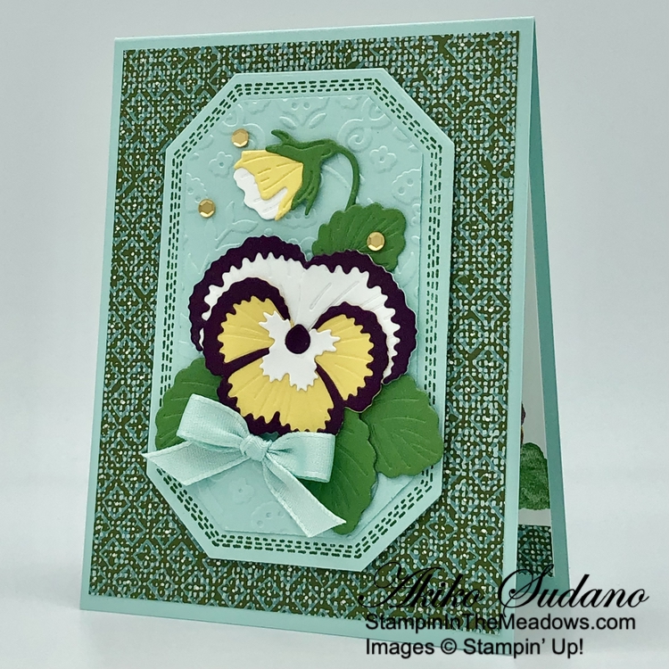 I adhered the assembled bud to the card with glue dots and popped the large pansy flower on the card with dimensionals. I tucked three large leaves and one small leaf under the flower, adhering them with glue dots. I made a Pool Party bow and adhered it with a glue dot. I finished the card front with three small gold sequins.