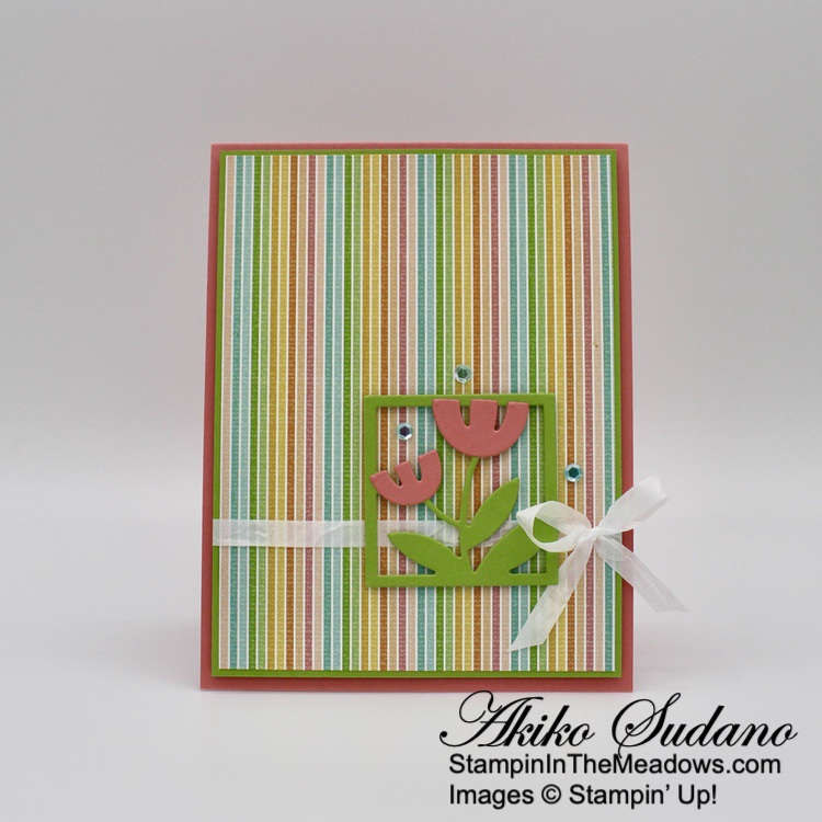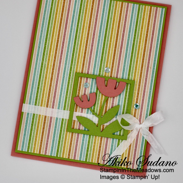 I embossed a strip of Real Red with the new Gingham embossing folder and adhered it to a panel of striped Pattern Party designer series paper. I adhered the layered DSP to the front of a Granny Apple Green card base.