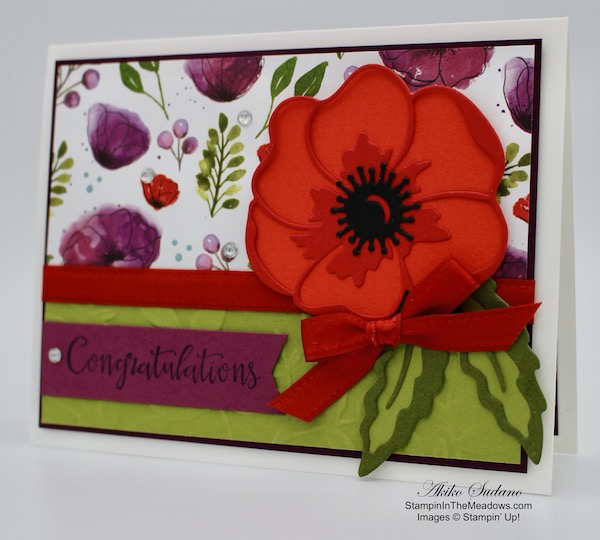 I used the small bouquet die from the Cottage Flowers dies to cut a silver foil panel and adhered the flowers to the card with dots of liquid glue. I adhered a Gray Granite bow to the card with glue dots and finished with rhinestone jewels.
