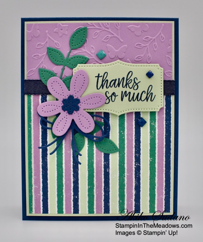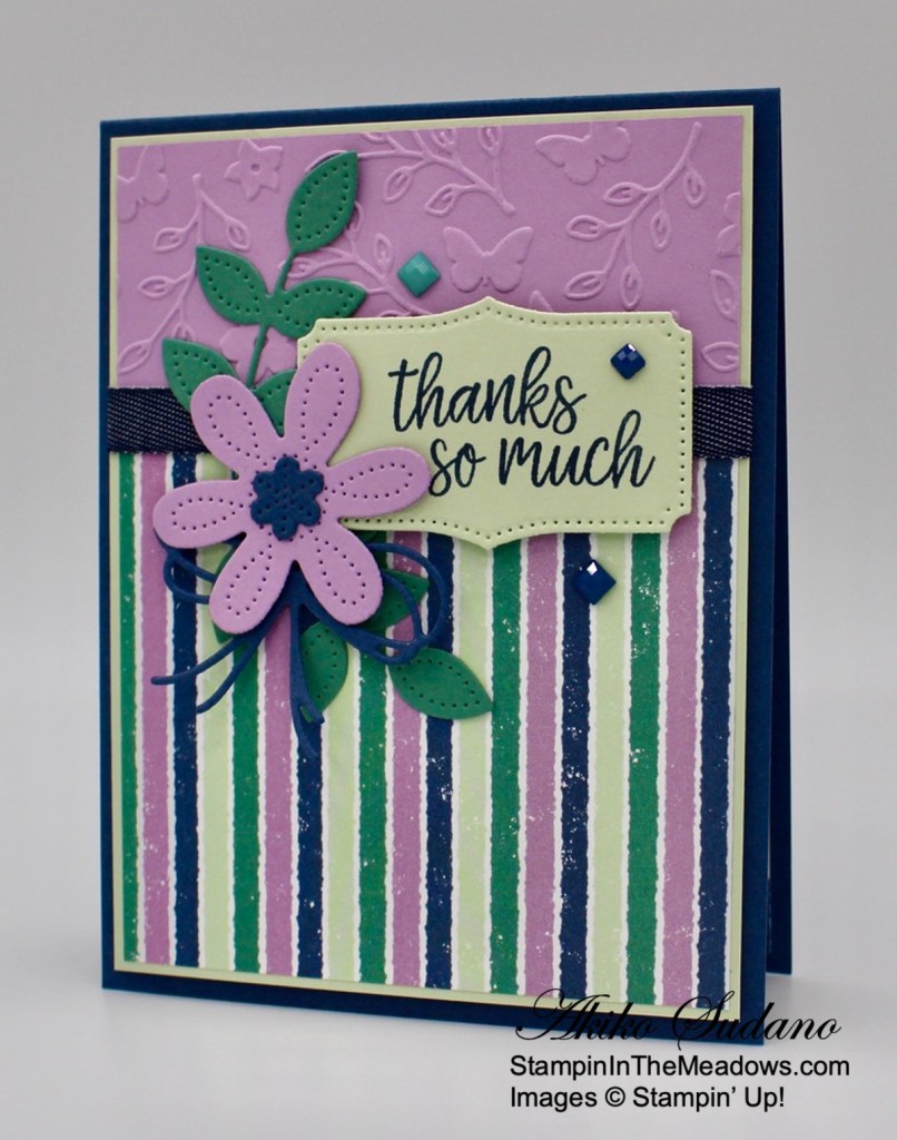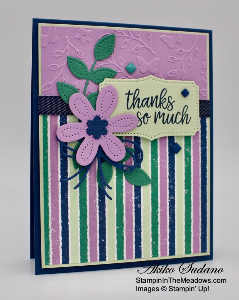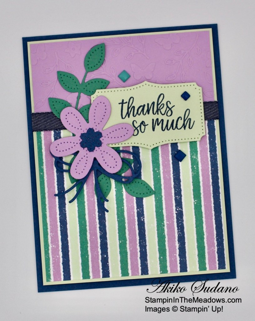 I love the die cut flowers from the Pierced Blooms dies and the coordinating Stampin’ Up! In Bloom stamp set. The Fresh Freesia die cut flower looks so pretty with the striped Penguin Playmates designer series paper and makes a nice floral thank you card for the end of the summer. Time to make way for all things fall!