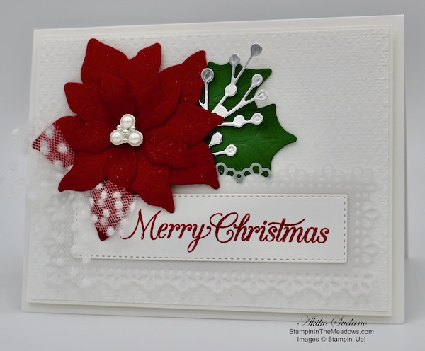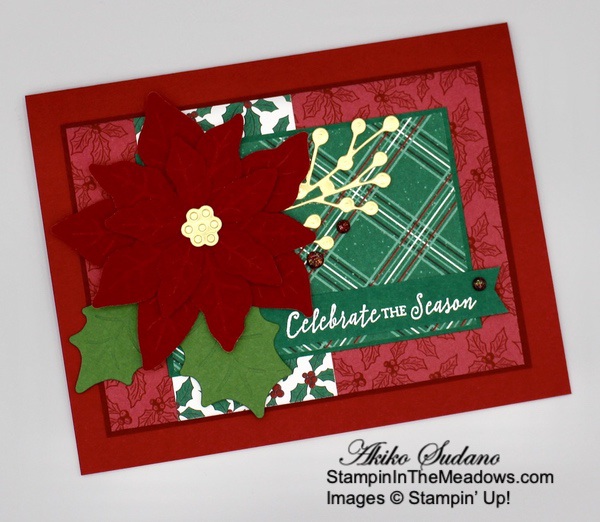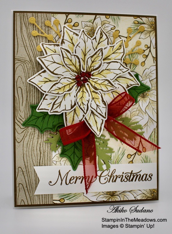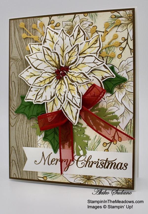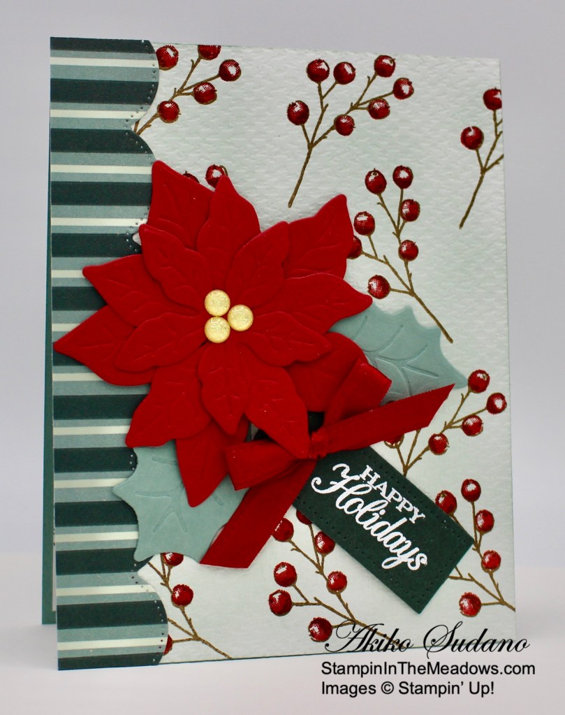The die cut poinsettia from the Stampin’ Up! Poinsettia Petals stamp set and Poinsettia dies are my all time favorite die cut poinsettia for Christmas cards. A single die cut poinsettia that is so dramatic – especially when cut from a specialty paper like the velvet!