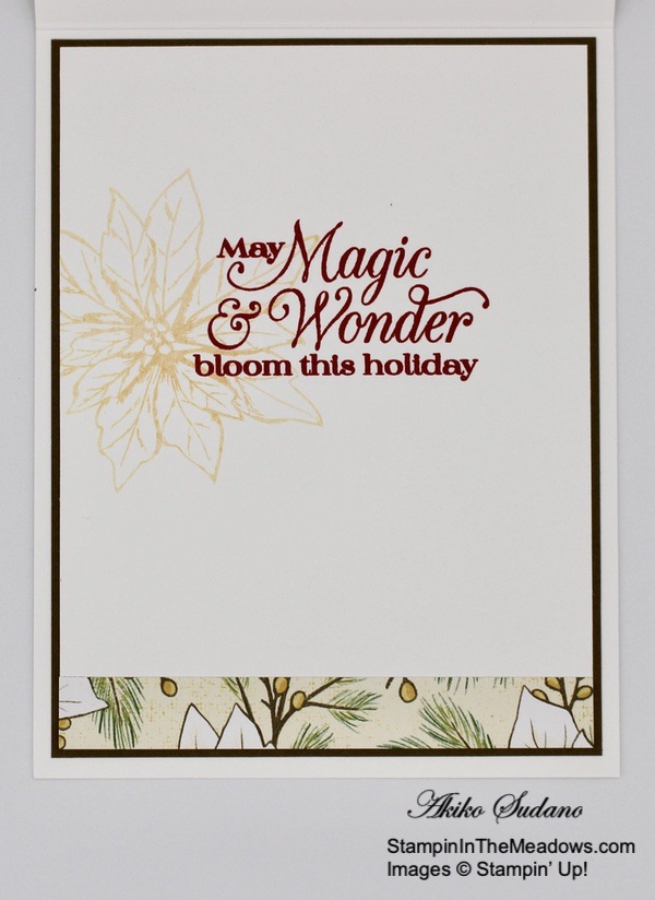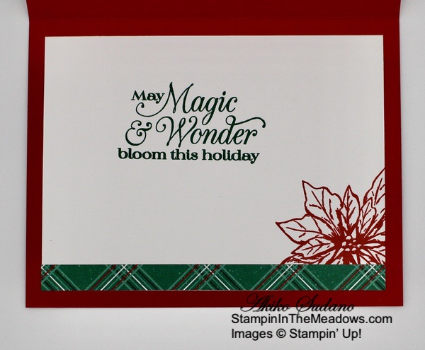 For the inside of the card, I stamped the sentiment from the Stampin’ Up! Poinsettia Petals stamp set in Real Red on Basic White. I stamped the little holly flourish from the Whimsical Trees stamp set next to the sentiment in Soft Sea Foam and trimmed the bottom of the panel with a strip of the Painted Christmas DSP. I adhered the panel to the inside of the card.