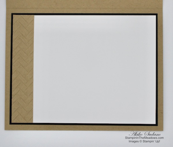 I stamped the sentiment from the Stampin’ Up! Peaceful Moments stamp set in Poppy Parade ink on a Whisper White Panel and trimmed the bottom with the striped DSP. I adhered the panel to the inside of the card.