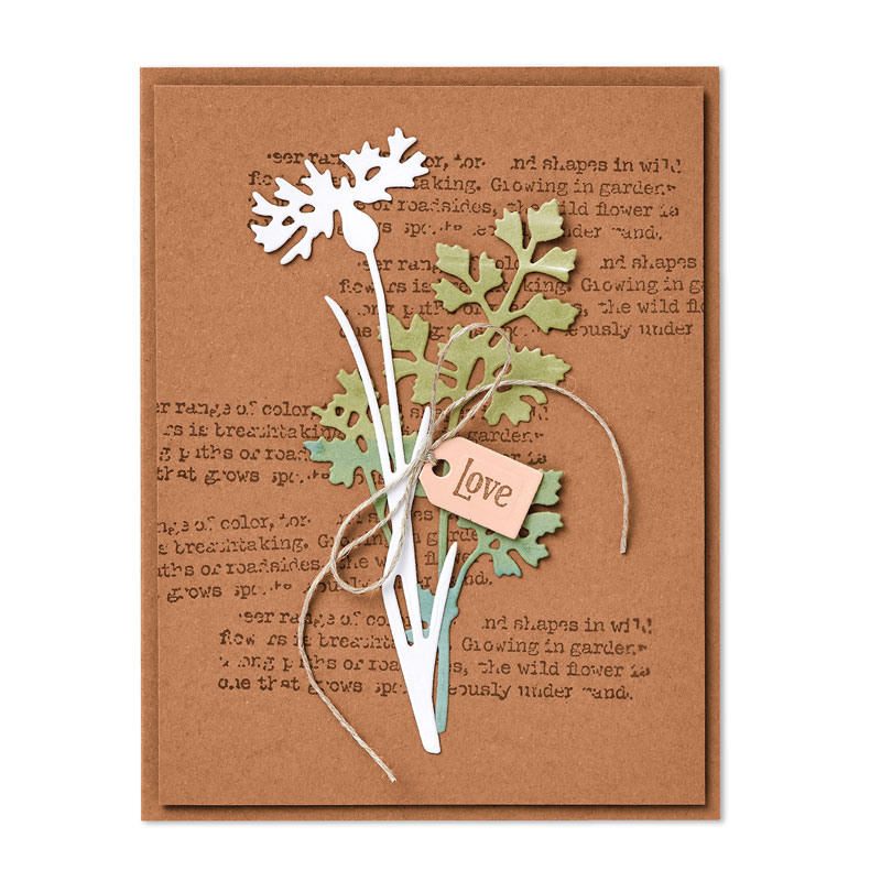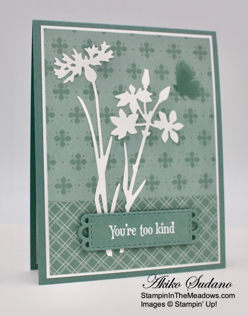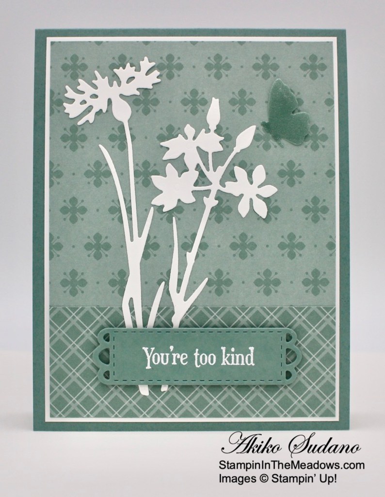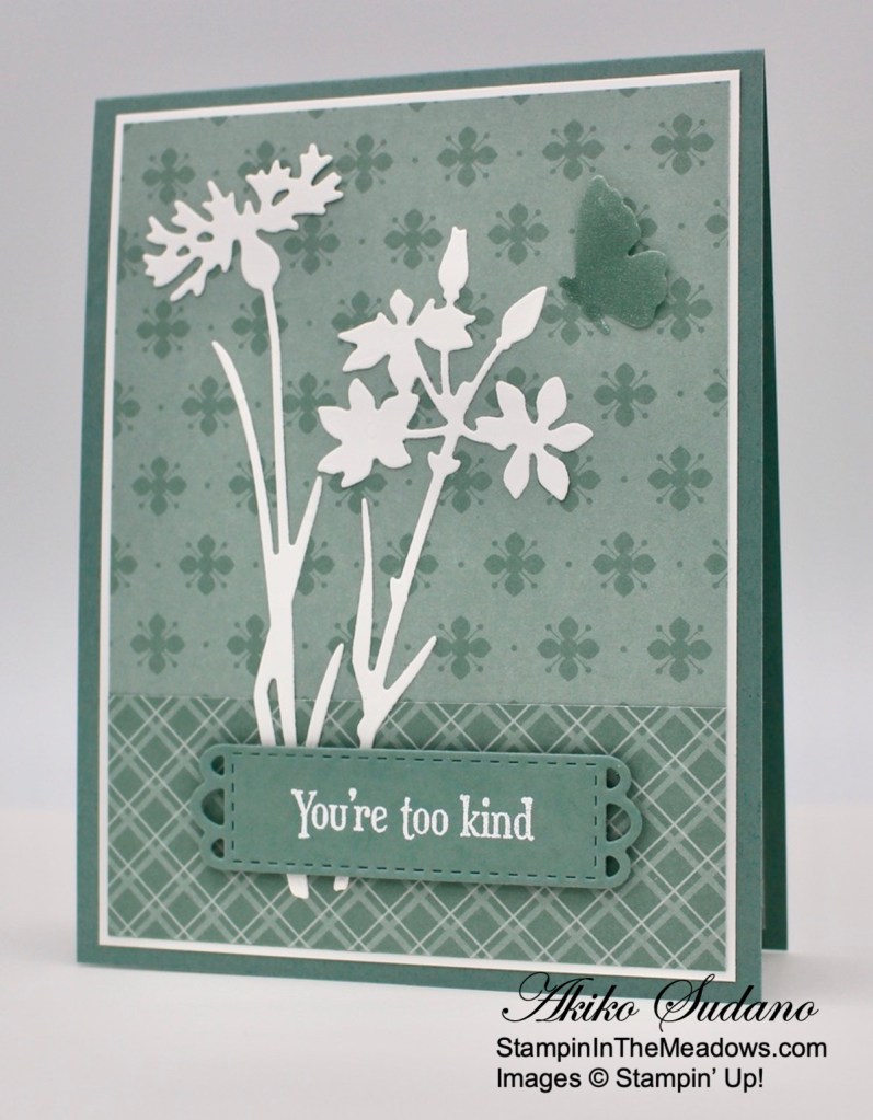 The wildflowers in the Inked Botanicals 6″ x 6″ designer series paper go great with the die cut flowers from the Meadows dies and I love it when new products go so well with old favorites! I also stamped the side of a Basic White with the Stampin’ Up! Quiet Meadow flowers to match the inside of the card.
