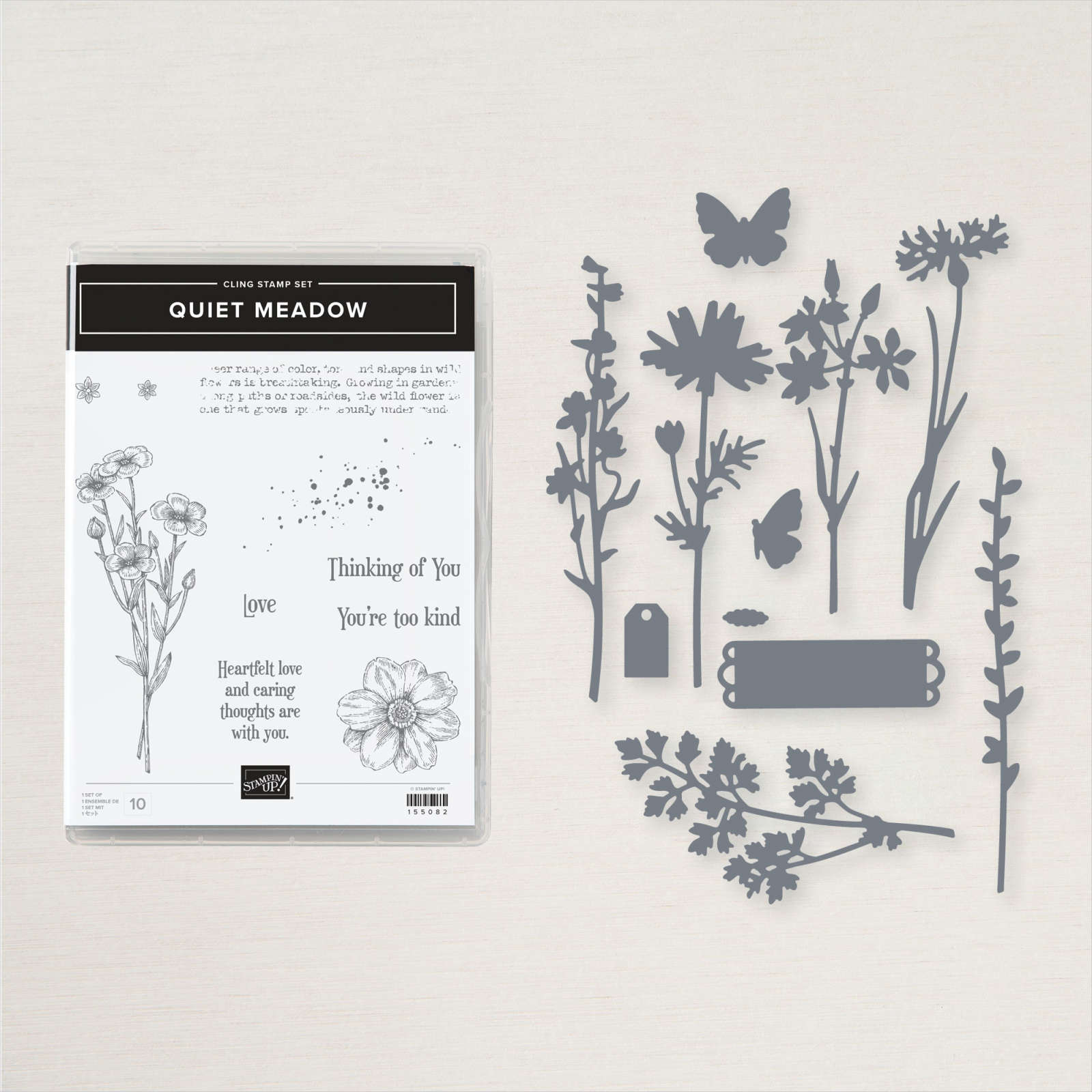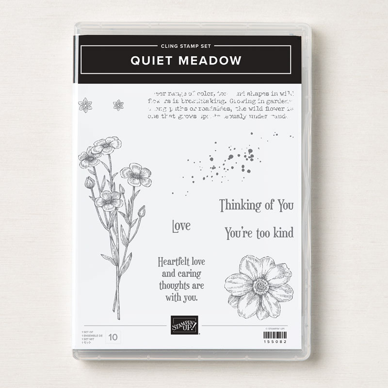 Good Morning! The Stampin’ Up! Quiet Meadow cling stamp set and Meadows dies are favorites with sweet sentiments, pretty flowers and gorgeous floral dies. I paired the stamps and dies with the new Inked Botanicals 6″ x 6″ designer series paper for a fresh take on these favorites. You can find the supplies I used at the bottom of my post along with the sizes of cardstock used.