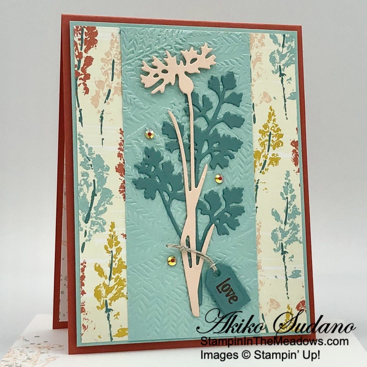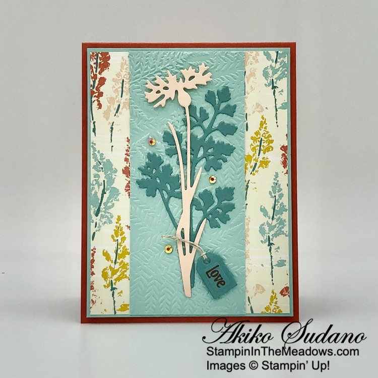 I used the fern die from the Meadows dies to cut a Lost Lagoon panel and I used the flower die to cut a Petal Pink panel. I adhered the die cut fern to the card with dots of liquid glue. I stamped the sentiment from the Stampin’ Up! Quiet Meadow stamp set in Copper Clay ink on Lost Lagoon card stock and cut it out with the little tag die.