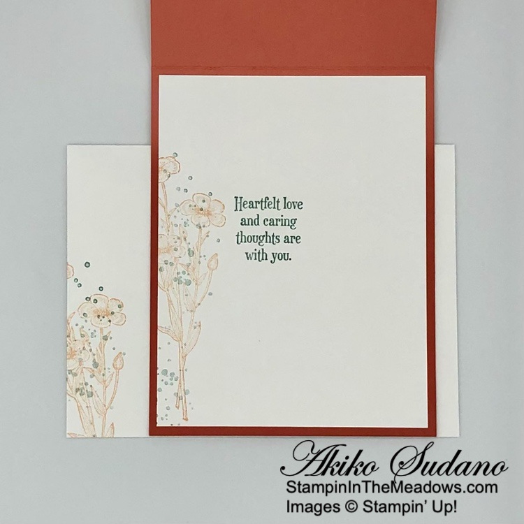 For the inside of the card, I stamped the flower from the Stampin’ Up! Quiet Meadow stamp set in Petal Pink ink on the side of a Basic White panel. I inked the spatter stamp with Lost Lagoon ink and stamped off twice before stamping over the flower. I stamped the sentiment in Lost Lagoon and adhered the panel to the inside of the card with Stampin’ Seal.