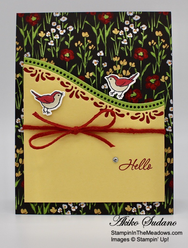 I used the discarded edge again to line up the dotted edge die on the Granny Apple Green panel and cut it out and adhered the panel to the back of the So Saffron panel. I wrapped a length of Real Red braided linen trim around the panel and tied a bow. I adhered the layered die cut panel to the card front with dimensionals.