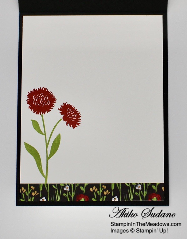 I stamped the flower and stem from the Field of Flowers photopolymer stamp set in Real Red and Granny Apple Green on a Whisper White panel. I trimmed the bottom with a strip of Flower & Field DSP and adhered the panel to the inside of the card.