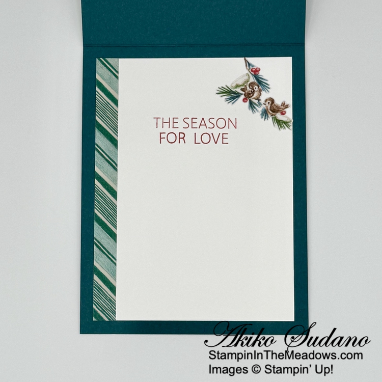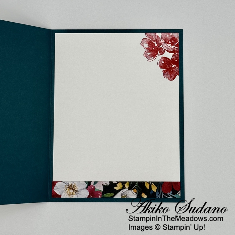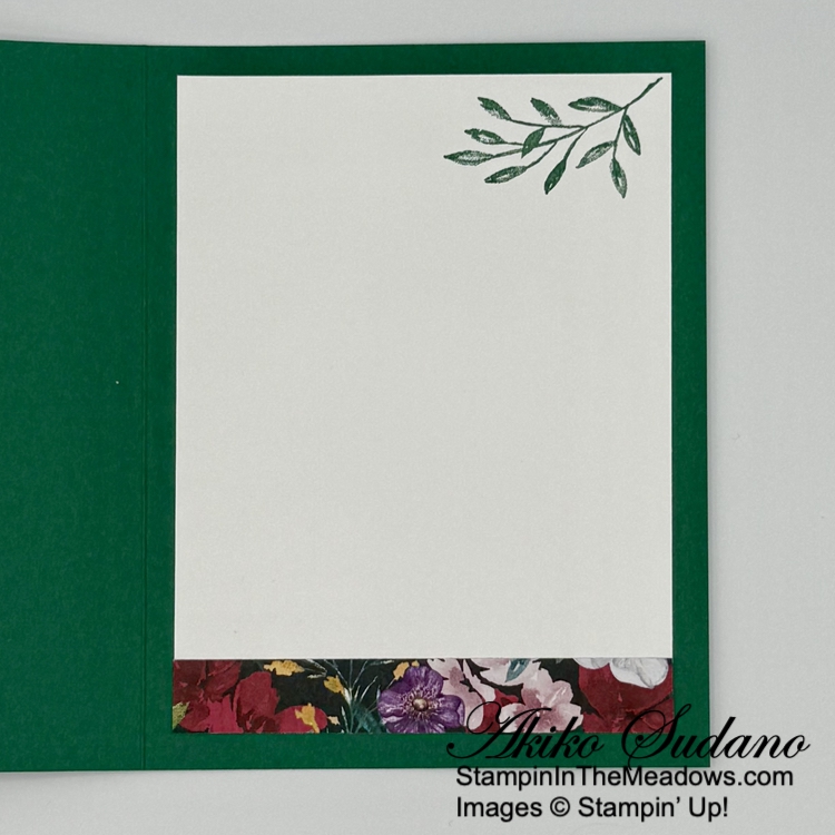 For the inside of the card, I stamped the sprig from the Stampin’ Up! Regal Flora stamp set using Bubble Bath ink in the corner of a Very Vanilla panel. I used my Blue and Fresh Freesia colored pencils to outline and accent the leaves and dotted the berries on the twigs with the Real Red colored pencil. This tied the sprig colors nicely to the DSP! I trimmed the side with DSP and adhered the panel to the inside of the card with Stampin’ Seal.
