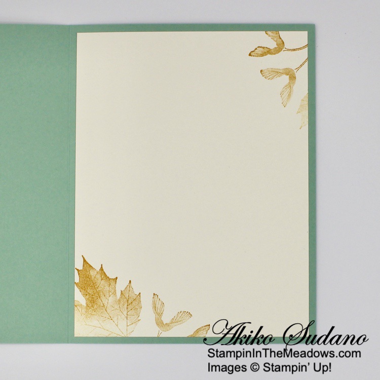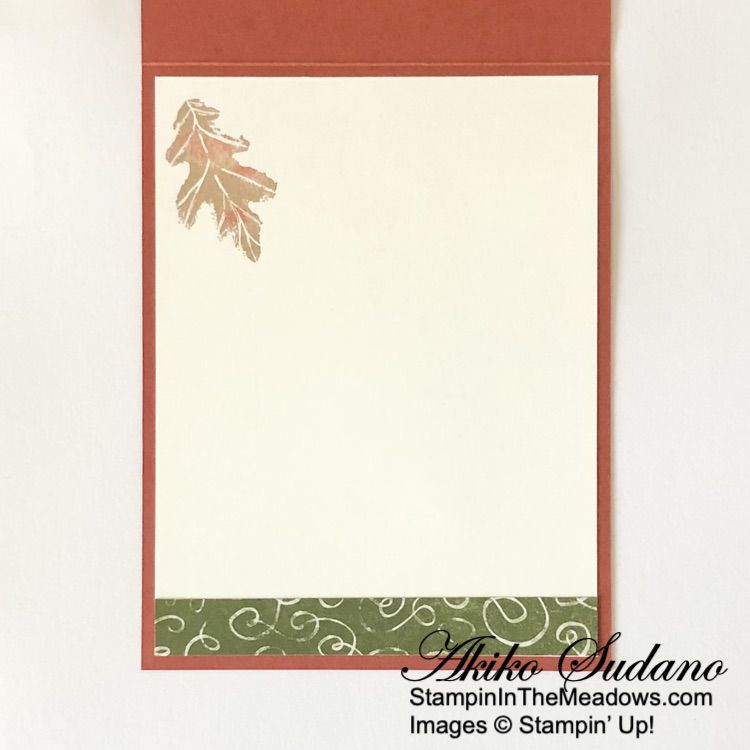 For the inside of the card, I stamped the acorn and leaf from the Stampin’ Up! Fond Of Autumn stamp set in Soft Suede on Basic White. I colored them with Granny Apple Green and Soft Suede Stampin’ Blends and cut them out with the coordinating dies. I adhered them to the top corner of a Basic White card base and trimmed the bottom with a strip of Rustic Harvest DSP. I adhered the panel to the inside of the card with Stampin’ Seal.