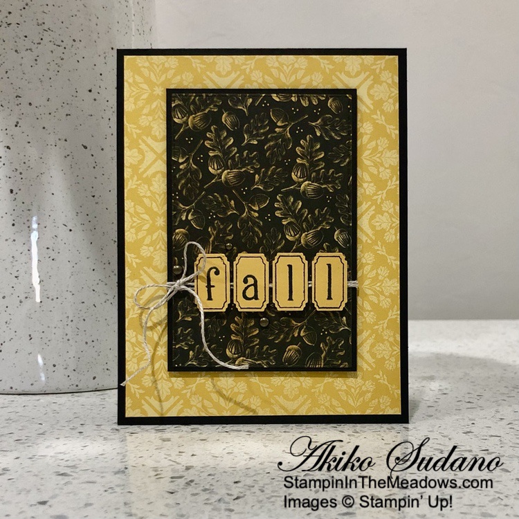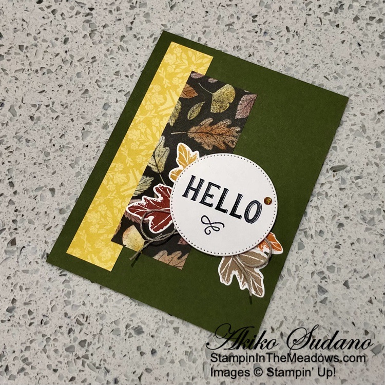 I adhered some loops of linen thread to the greenery with Stampin’ Seal. I stamped the sentiment from the Stampin’ Up! Fond Of Autumn stamp set in Soft Suede ink on a strip of Basic White and adhered it to a Soft Suede mat. I adhered the label to the card with dimensionals over the linen thread and finished it with a Rustic Metallic dot.