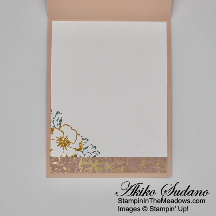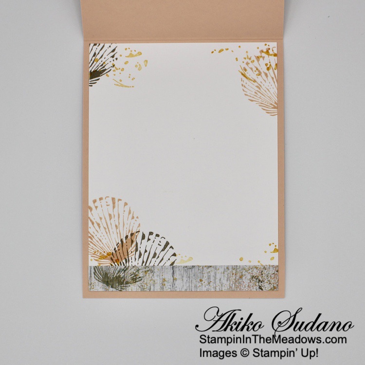 For the inside of the card, I stamped the sentiment from the Stampin’ Up! Season of Chic stamp set in Sahara Sand on a Basic White panel. I stamped the shells from the two stamp sets around the edges of the panel and trimmed the bottom with a strip of By the Bay DSP. I adhered another distressed gold clamshell to the bottom before adhering it to the inside of the card. I made a coordinating envelope by stamping the shells on the front and adhering DSP to the back flap.