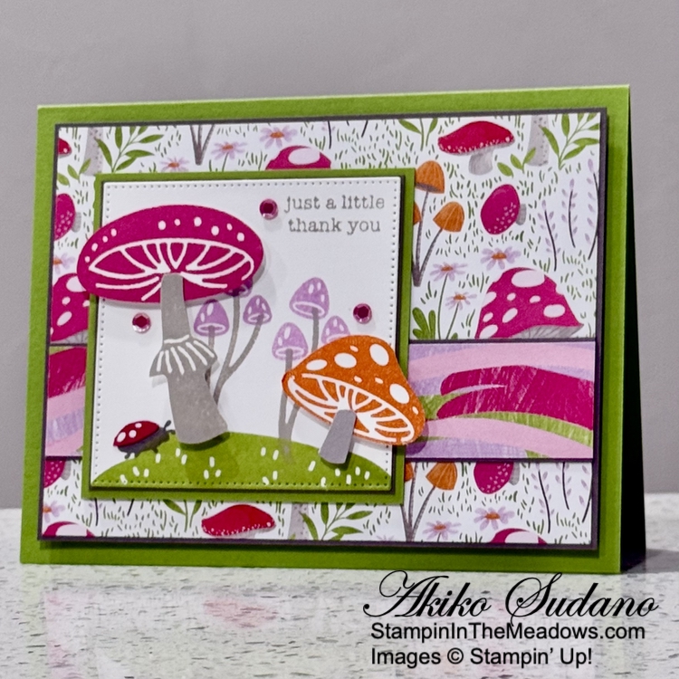 I used the leaf sprigs from the Delicate Forest dies to cut a granny Apple Green panel and adhered them to the card with liquid glue. I stamped the mushroom caps from the Stampin’ Up! Terrific Toadstools bundle using Melon Mambo and Pumpkin Pie inks on Basic White and punched them out with the Terrific Toadstools punch. I stamped the mushroom stems using Gray Granite ink on Basic White and fussy cut them with my paper snips. I adhered the stems to the caps with liquid glue and popped them on the card with dimensionals.