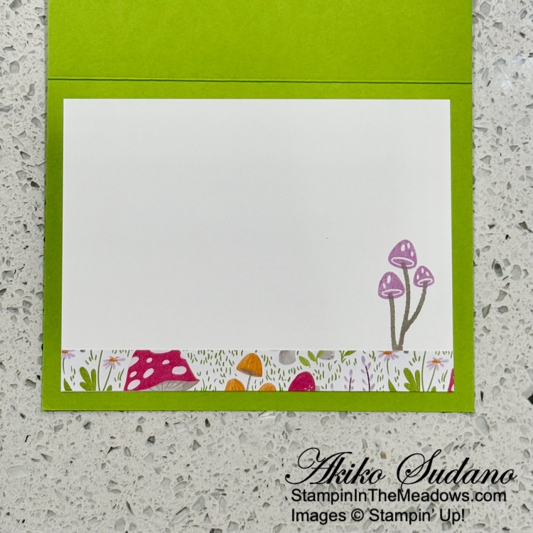 The inside panel is on the back of the front center panel and I stamped the mushroom, stems and leaf sprig from the Stampin’ Up! Terrific Toadstools stamp set in Melon Mambo, Gray Granite and Granny Apple Green inks on Basic White. I adhered the panel to the card and adhered panels of the striped Toadstool Gardens DSP to each of the back panels.