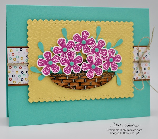 I arranged the leaves on the card front and adhered them to the card with glue dots. I adhered the basket with dimensionals and added an enamel dot to finish the label.