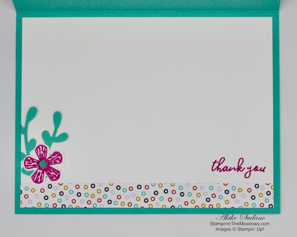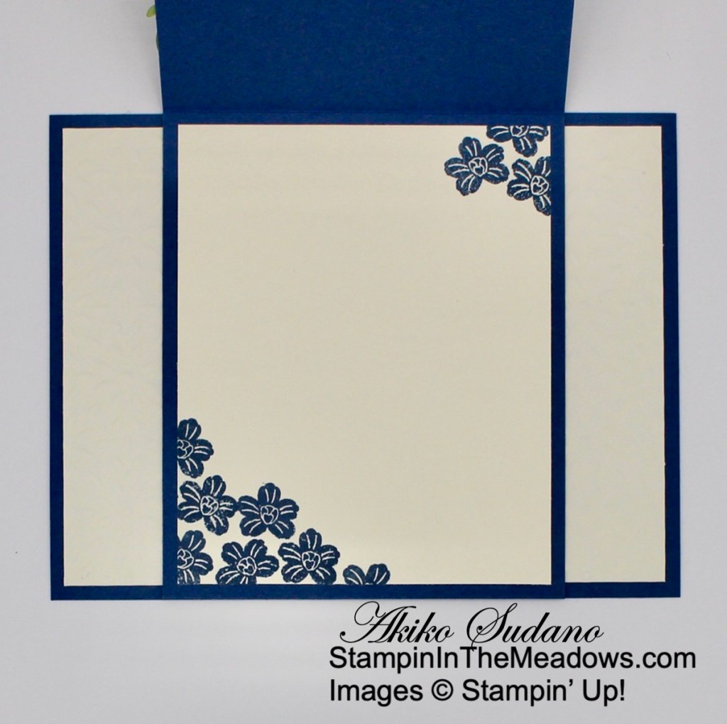For the inside of the card, I stamped the flower trio from the Stampin’ Up! Boho Indigo stamp set in the corners of a Very Vanilla panel with Misty Moonlight ink. I adhered the panel to the inside of the card.
