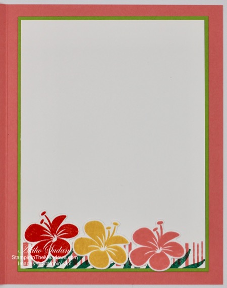 On the inside of the card I stamped three flowers from the Painted Poppies stamp set in Calypso Coral ink after stamping off on a panel of Whisper White. I used the splotch stamp from the set to color the poppies in Petal Pink ink. I stamped three leaves in Mint Macaron after stamping off and then adhered it to the inside of the card with snail. I stamped a Whisper White envelope the same way as the inside panel.