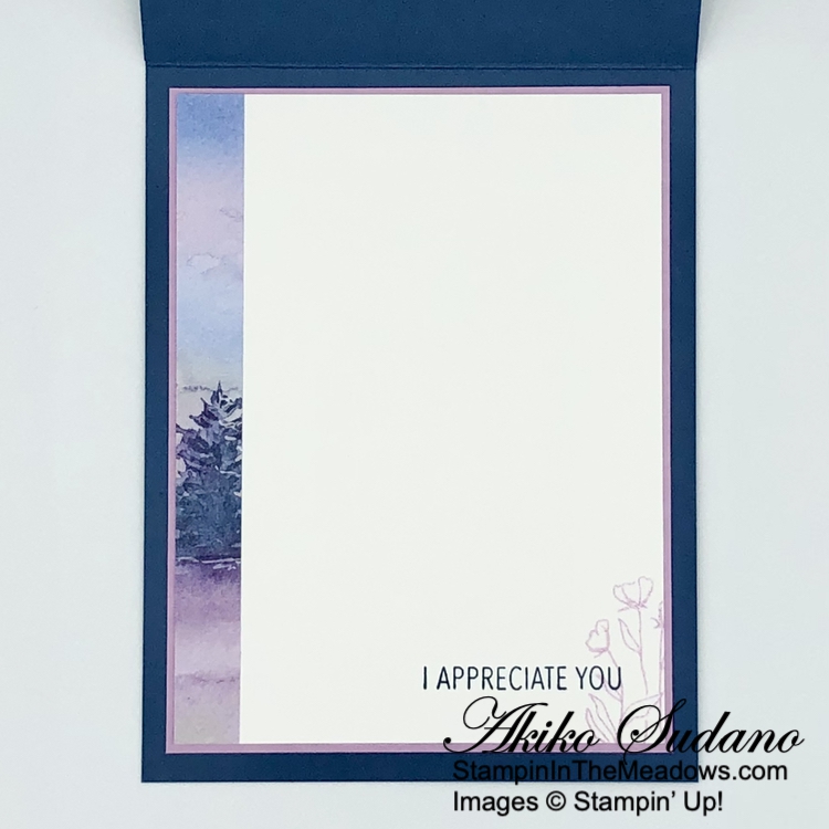 For the inside of the card I stamped the sentiment from the Stampin’ Up! Thoughtful Wishes stamp set using Mossy Meadow ink on the side of a Basic White panel. I trimmed thr panel with the thin Thoughtful Journey DSP panel and adhered the panel to the inside of the card with Stampin’ Seal. I love how you can see the wide image when the card is open!