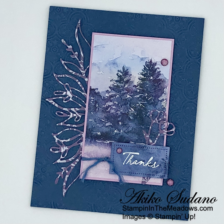 Good Morning! Here’s a simple thank you card made with the pretty Stampin’ Up! Thoughtful Wishes bundle along with the Thoughtful Journey 6″ x 6″ designer series paper. I also used the gorgeous Thoughtful Designs specialty DSP for a luxurious background. You can find the products I used at the bottom of my post along with the card stock sizes.