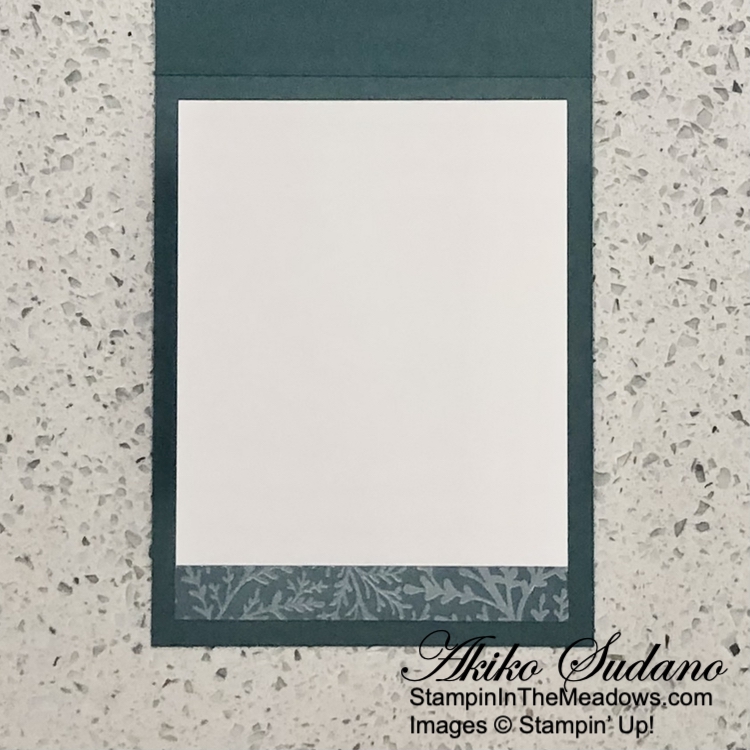 For the inside, I inked up the leafy stalk stamp from the Stampin’ Up! Thoughtful Wishes stamp set with Lost Lagoon ink. I applied some Mossy Meadow and Pretty Peacock ink to the stamp with a sponge dauber and stamped it off before stamping the side of a Basic White panel. I trimmed the bottom with DSP and adhered the panel to the inside of the card with Stampin’ Seal.