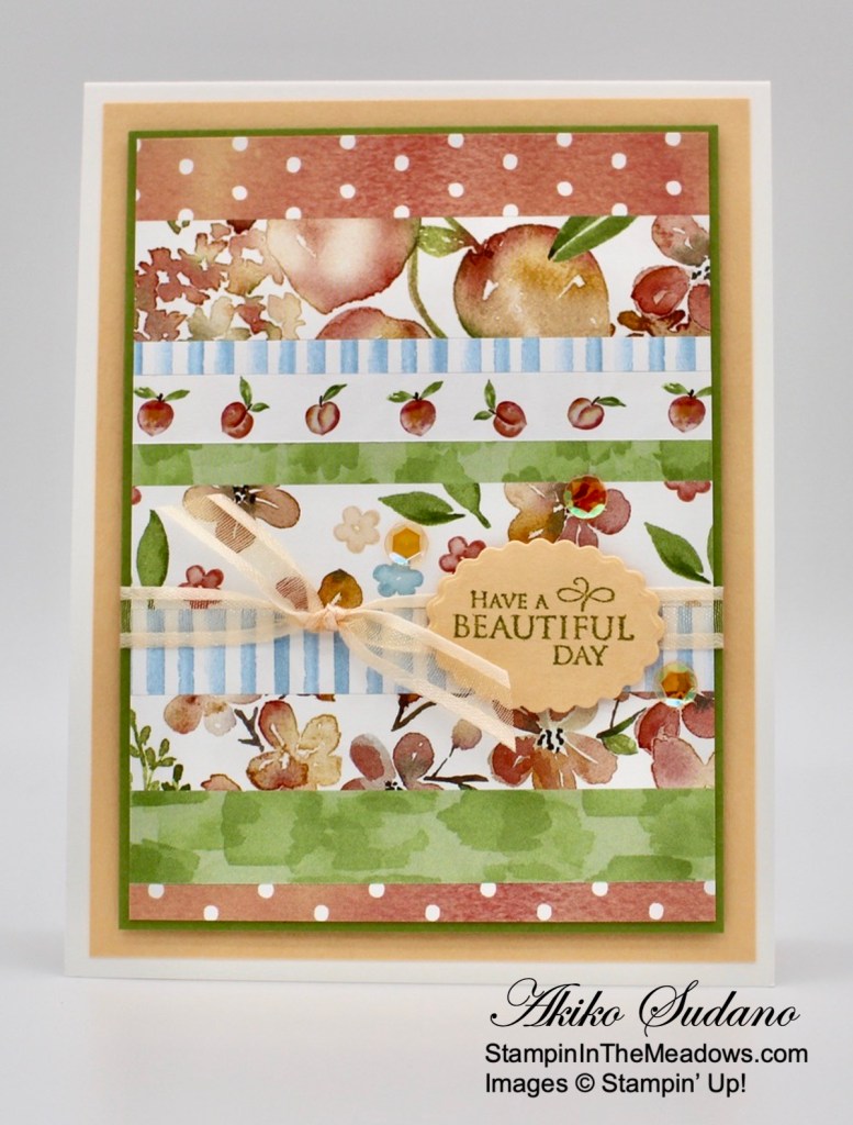 The sentiments from the Stampin’ Up! Very Versailles stamp set are just beautiful! And this is a sweet one for a simple card with the pretty You’re A Peach DSP. The strip technique is a great way to use up the pretty scraps from larger projects that you can’t bear to throw away. And the results are always nice!