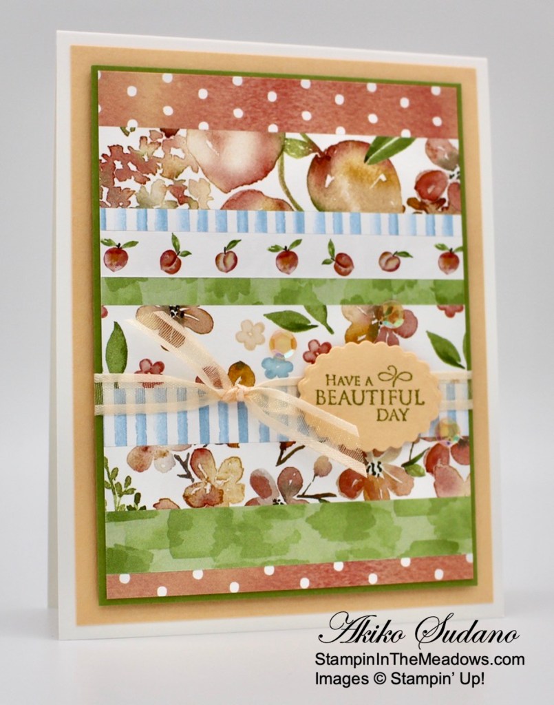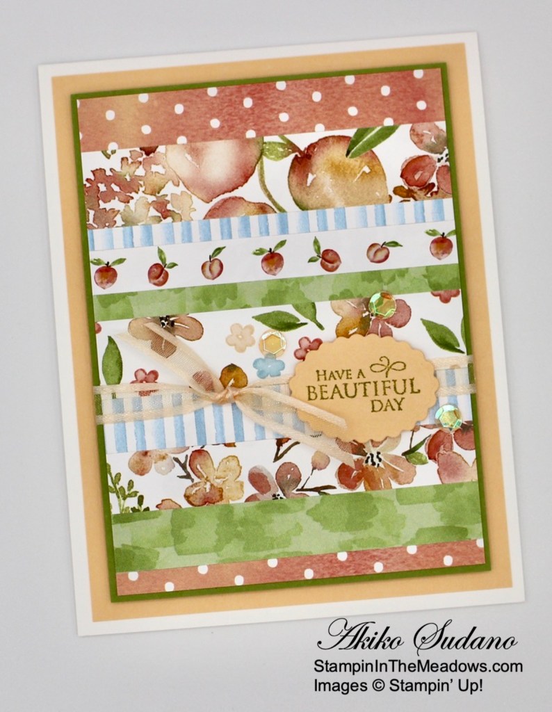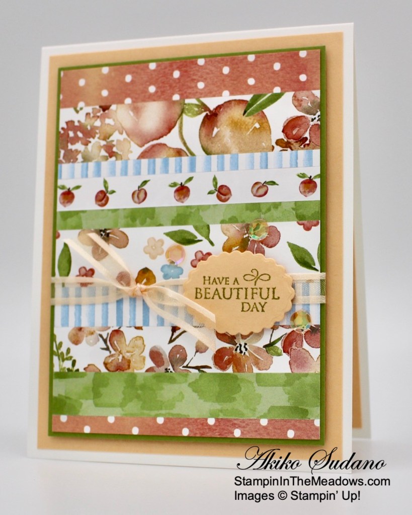 Happy Friday! I used the pretty Stampin’ Up! Very Versailles cling stamp set to make a note card wishing you a beautiful day. I paired it with scraps from the beautiful You’re A Peach designer series paper to make a striped background. You can find the supplies I used at the bottom of my post along with the sizes of cardstock used.