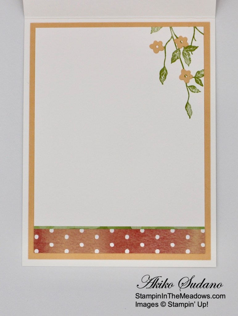 For the inside of the card, I stamped the leaves from the Stampin’ Up! Very Versailles stamp set in Pear Pizzazz ink on a Basic White panel. I cut out the flower trio from the Peach dies using Pale Papaya and adhered them to the leaves with liquid glue. I adhered Pear Pizzazz and Calypso Coral strips of You’re A Peach DSP to the bottom of the panel and adhered the panel to a Pale Papaya mat and then to the inside of the card.