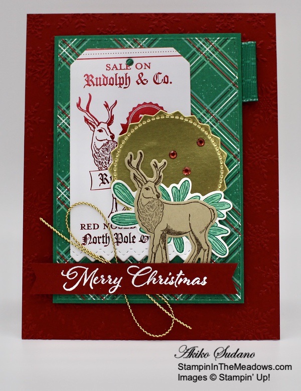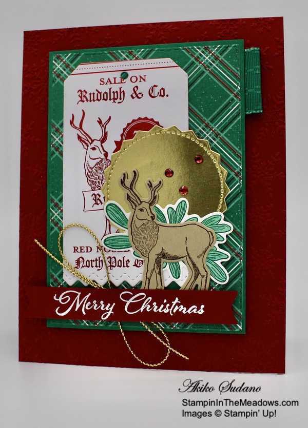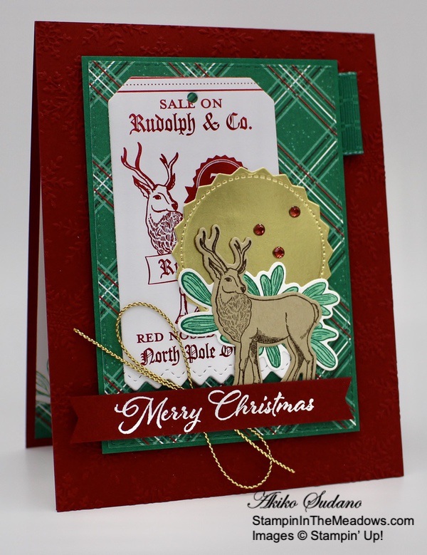I cut three poinsettia leaves from green foil and two silver foil berry sprigs using the dies from the Stampin’ Up! Poinsettia Petals bundle. I used the tag die from the North Pole Wonder Dies to cut a tag from the Wonder of the Season specialty designer series paper and adhered the leaves, berry sprigs and flower to the tag with glue dots.